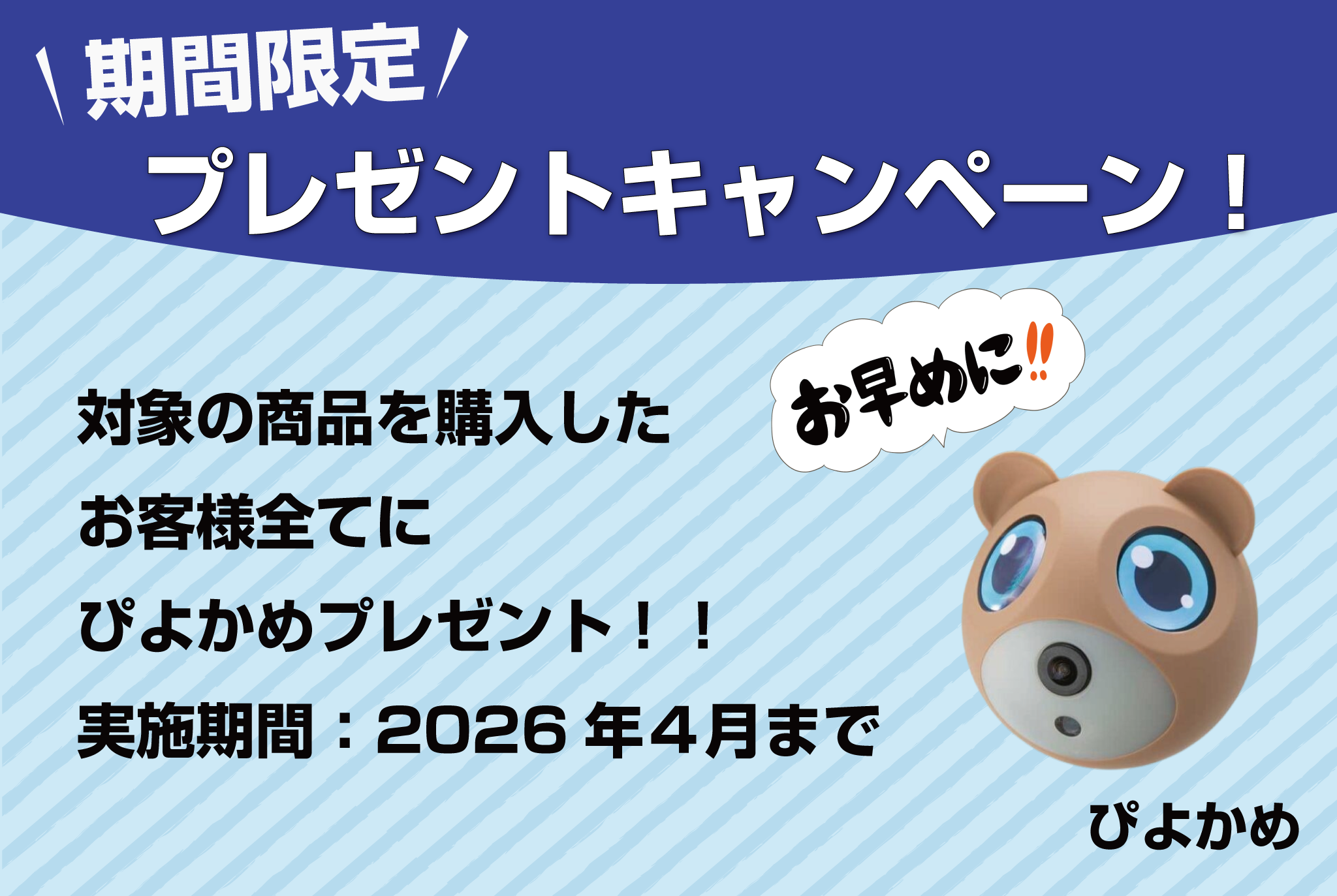 対象商品を購入していただいたお客様すべてに 可愛い見た目の見守りカメラ「ぴよかめ […]